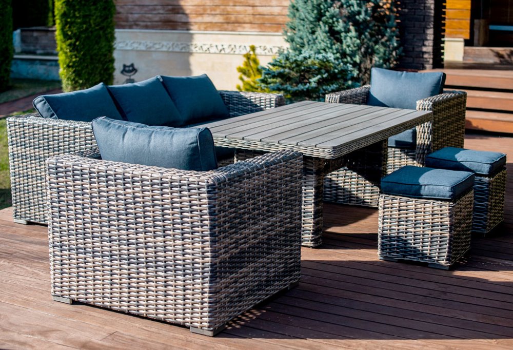 Эта мебель отличается обычно крупными габаритами, поэтому искусственный ротанг здесь придется как нельзя кстати – так как такую мебель не обязательно убирать каждый раз с улицы. Обычно это лаконичная мебель правильных геометрических форм, которая больше подходит для современных дизайнов скандинавского интерьера, ровных газонов или лаунж-зон для вечерних посиделок.